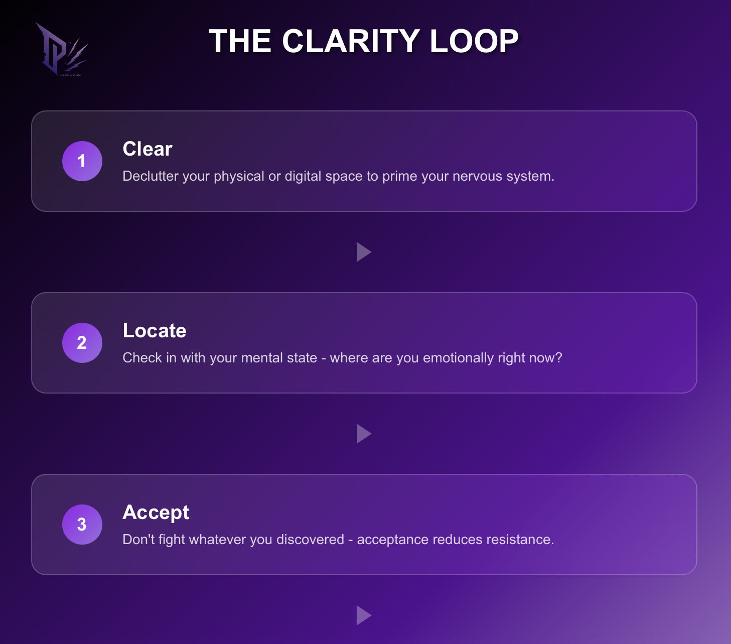 The Clarity Loop: This is a framework that I developed on my own, and it goes like this: Clear → Locate → Accept → Re-align → Intend → Tidy → Yield. You clear your space, see where you are, accept your current situation, choose a better intention, prepare yourself, then execute.