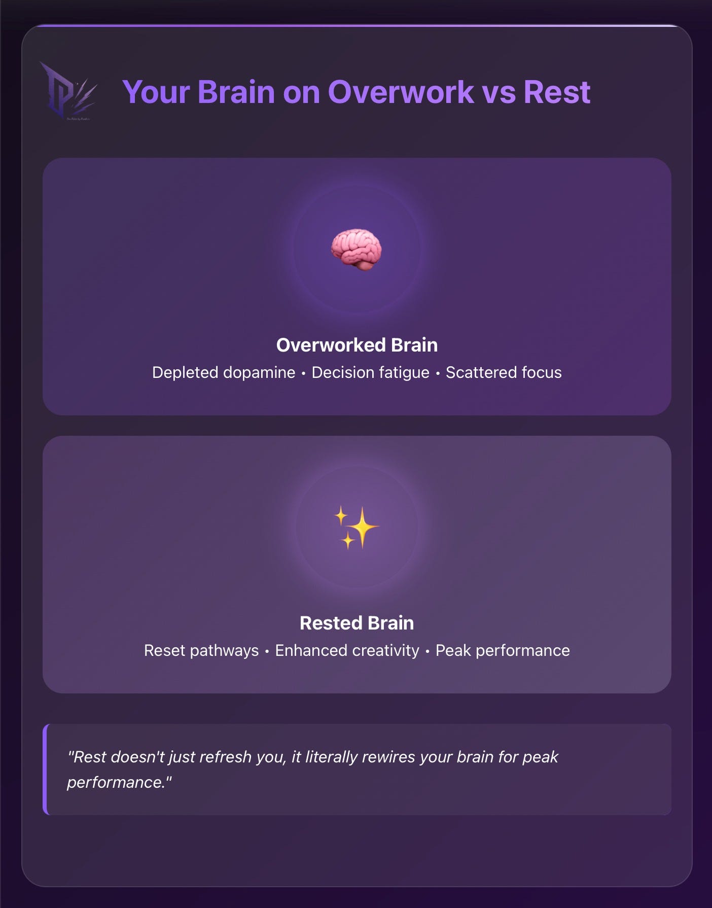 And it is that: Overwork kills focus, creativity, and motivation. Without rest, you’re running on fumes, no matter how hard you push.